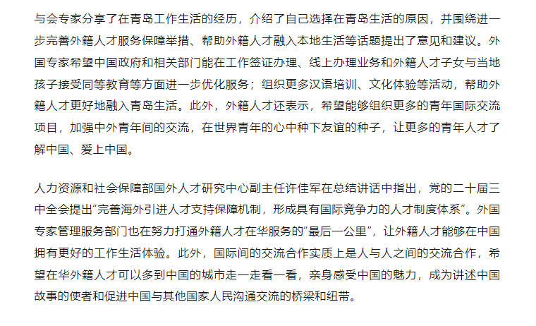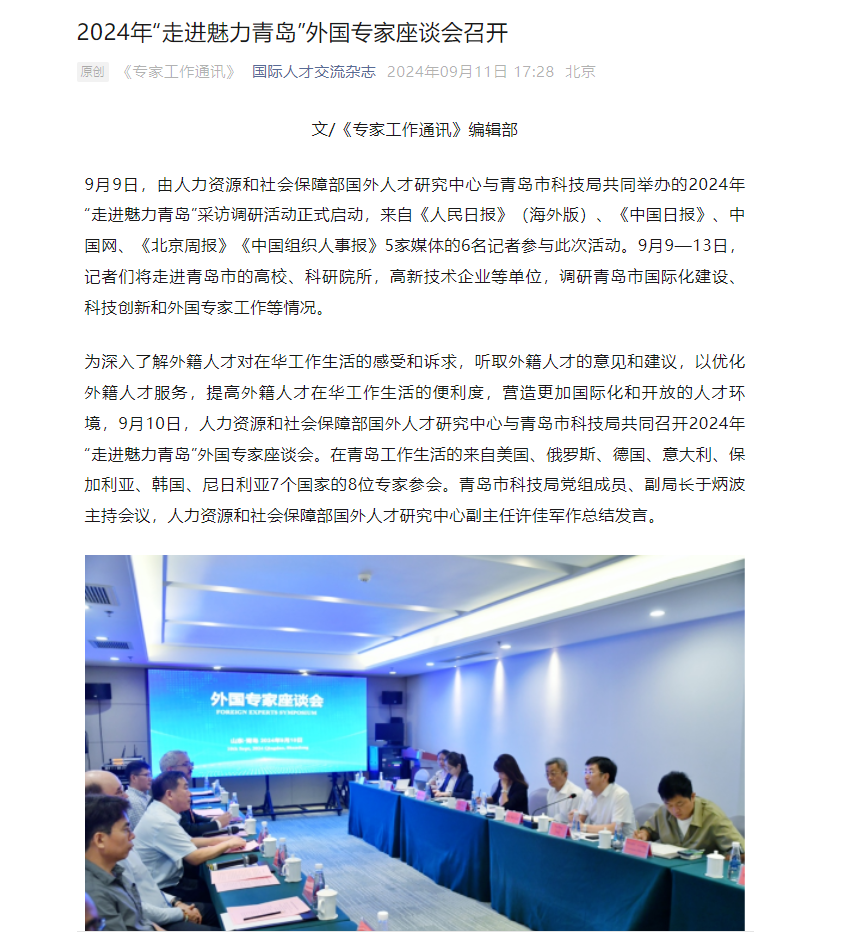 2024年9月9日,由人力資源和社會保障部國外人才研究中心與青島市科技局共同舉辦的2024年“走進魅力青島”采訪調(diào)研活動正式啟動,來自《人民日報》(海外版)、《中國日報》、中國網(wǎng)、《北京周報》《中國組織人事報》5家媒體的6名記者參與此次活動。中電綠網(wǎng)領(lǐng)導(dǎo)參加了2024年“走進魅力青島”外國專家座談會。