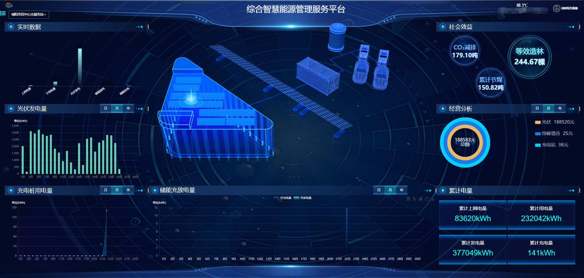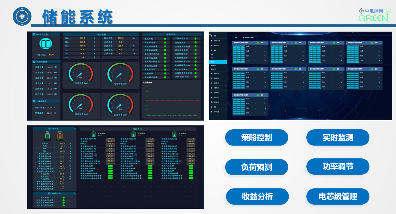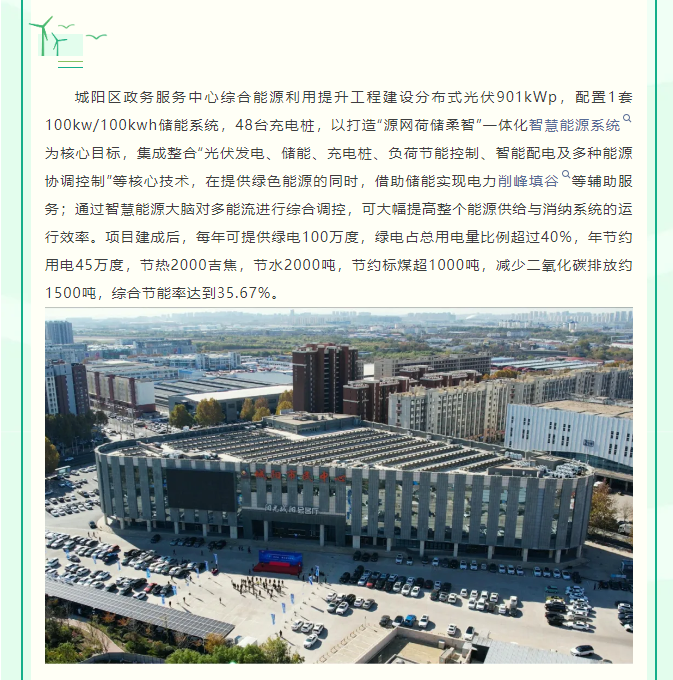 1.png?? ?城陽區(qū)政務(wù)服務(wù)中心綜合能源利用提升工程建設(shè)分布式光伏901kWp,配置1套100kw/100kwh儲能系統(tǒng),48臺充電樁,以打造“源網(wǎng)荷儲柔智”一體化智慧能源系統(tǒng)為核心目標(biāo),集成整合“光伏發(fā)電、儲能、充電樁、負(fù)荷節(jié)能控制、智能配電及多種能源協(xié)調(diào)控制”等核心技術(shù),在提供綠色能源的同時,借助儲能實現(xiàn)電力削峰填谷等輔助服務(wù);通過智慧能源大腦對多能流進行綜合調(diào)控,可大幅提高整個能源供給與消納系統(tǒng)的運行效率。項目建成后,每年可提供綠電100萬度,綠電占總用電量比例超過40%,年節(jié)約用電45萬度,節(jié)熱2000吉焦,節(jié)水2000噸,節(jié)約標(biāo)煤超1000噸,減少二氧化碳排放約1500噸,綜合節(jié)能率達(dá)到35.67%。1216.png??? 中電綠網(wǎng)承接、參建的城陽市民中心項目,以打造“源網(wǎng)荷儲柔智”一體化智慧能源系統(tǒng)為核心目標(biāo),集成整合“光伏發(fā)電、儲能、充電樁、智能配電及多種能源協(xié)調(diào)控制”等核心技術(shù),在提供綠色能源的同時,借助儲能實現(xiàn)電力削峰填谷等輔助服務(wù);通過智慧能源大腦對多能流進行綜合調(diào)控,可大幅提高整個能源供給與消納系統(tǒng)的運行效率。為用戶在成本收益管理方面,提供了精細(xì)化收益管理,實現(xiàn)光儲充荷收益綜合管理。